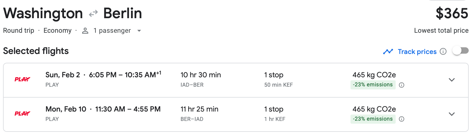 You can book fares on Play Airlines out of Dulles International Airport (IAD) near Washington, D.C., to Berlin in early 2025 for $365 round-trip. This route has layovers each way in Iceland, and you'll have to pay extra for a carry-on bag.
