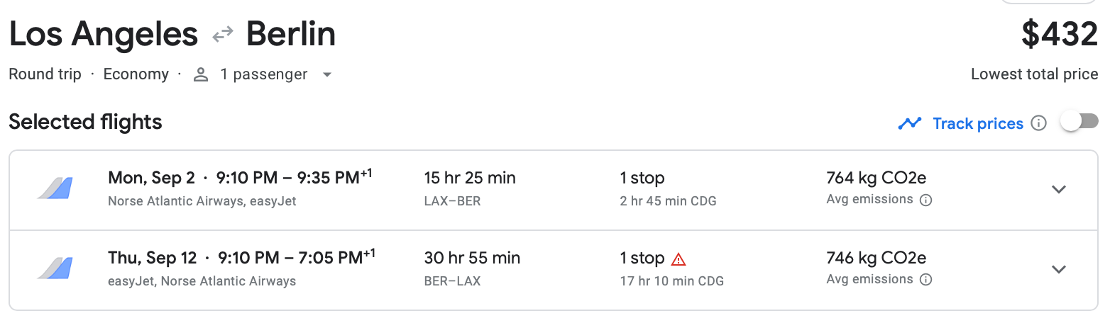 If you can travel in early September, you can book round-trip fares on Norse Atlantic from Los Angeles International Airport (LAX) to Berlin for only $432. That's a huge discount from typical prices for this route.