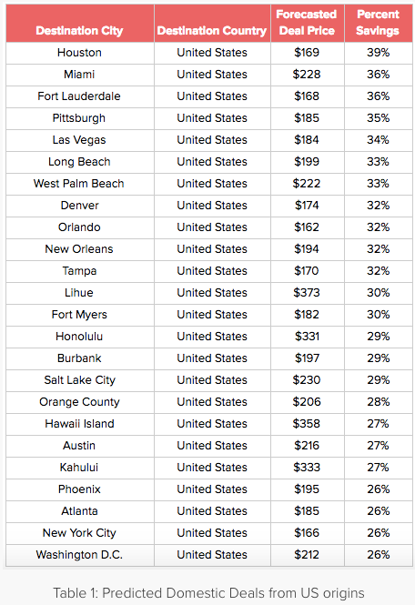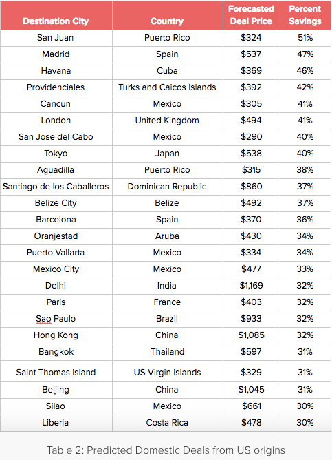 By analyzing billions of daily flight prices and patterns, Hopper claims to predict flight prices with 95% accuracy. Their team of data analysts is forecasting fares from US destinations to Paris averaging $403 (32% savings), flights to Tokyo for $538 (40% savings) and trips San Juan, Puerto Rico for $324 (51% savings), among other routes and destinations listed in the tables below.