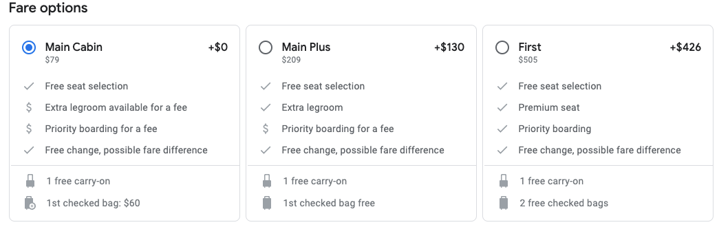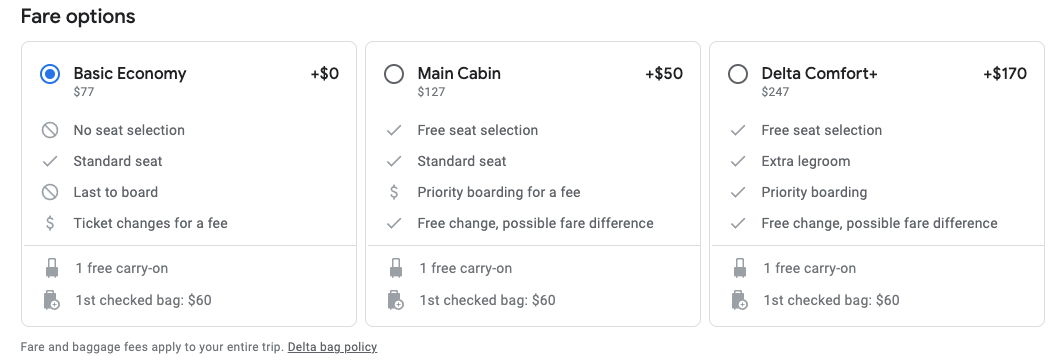 This is in Delta's basic economy class, so although you won't get to choose your seat, you will be able to carry on a bag, so expect to pay just $77. Otherwise, consider upgrading to their main cabin for seat selection and the flexibility to change your flight if need be.