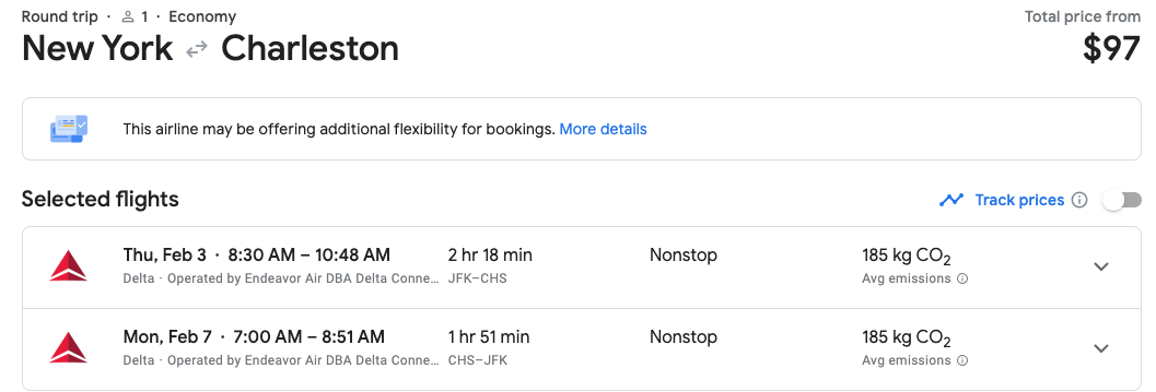 It's important to note that these fares work in reverse, so New York City-area travelers can also take advantage of this deal by swapping your origin and destination cities, as shown below with this JFK-CHS nonstop fare for $97 on Delta.