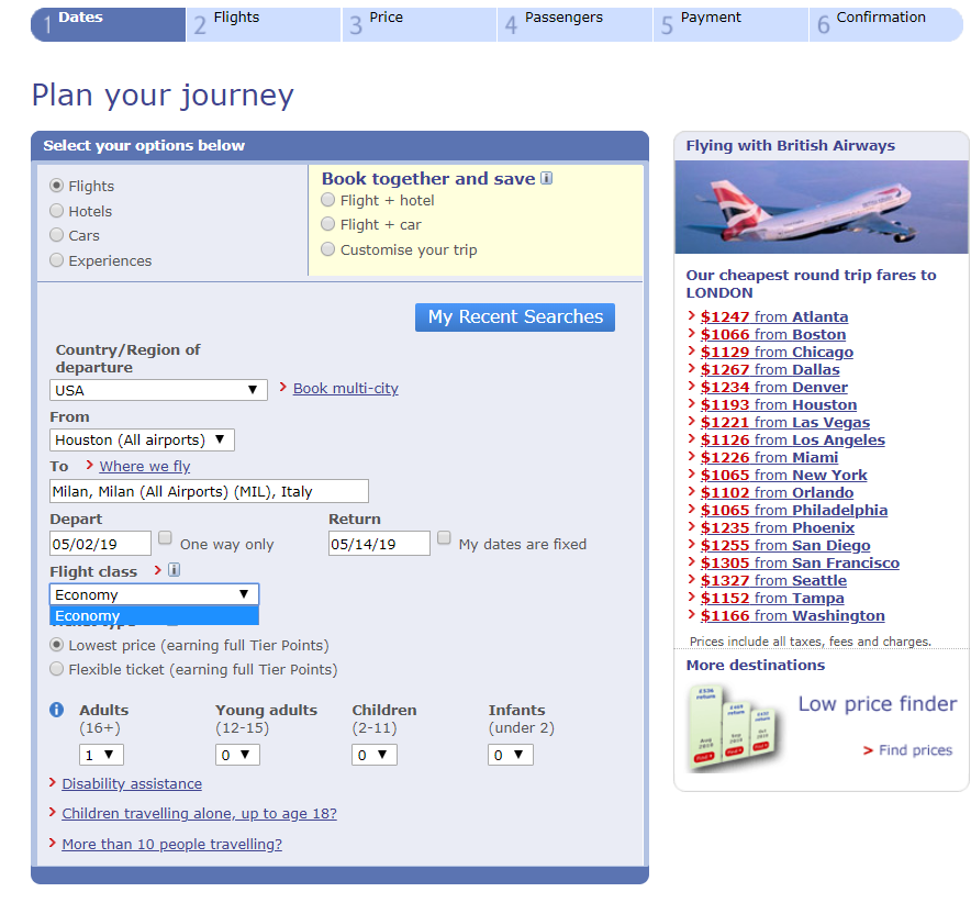 For this deal, I'd recommend finding cheap dates that work for your schedule through Google Flights first. Since the flights must be operated by and marketed by British Airways, you'll want to limit the airline to British Airways and select London as your connection airport. Here's a link with these two filters selected to get your search started.