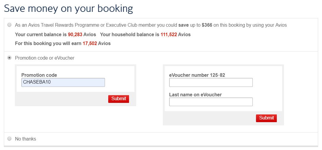 Once you get through those annoyances, you can pick out flights. Again, make sure to select British Airways-operated flights to get both discounts. After selecting flights and clicking continue, you'll need to click "Promotion code or eVoucher" and enter the discount code CHASEBA10 and click submit: