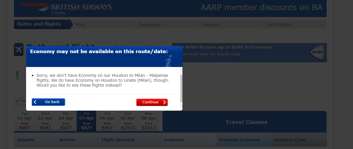 The next issue you're likely to run into is an error saying there's no economy flights -- which is a very strange error to get. Just click "continue":