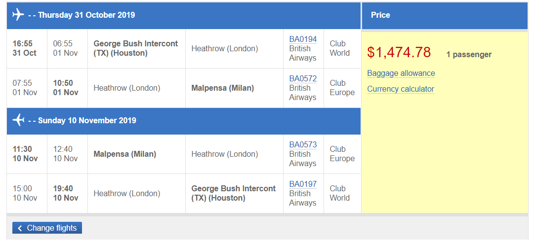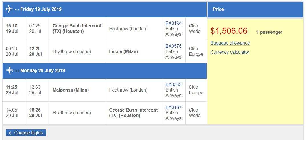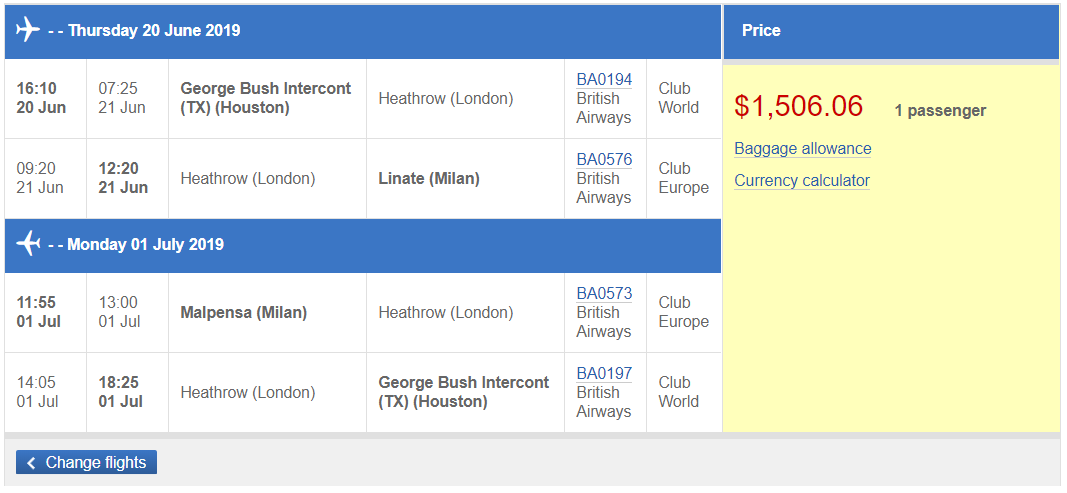 Houston Intercontinental (IAH) to Milan (MXP/LIN) for $1,506 round-trip in business class after AARP and Chase discounts in July: