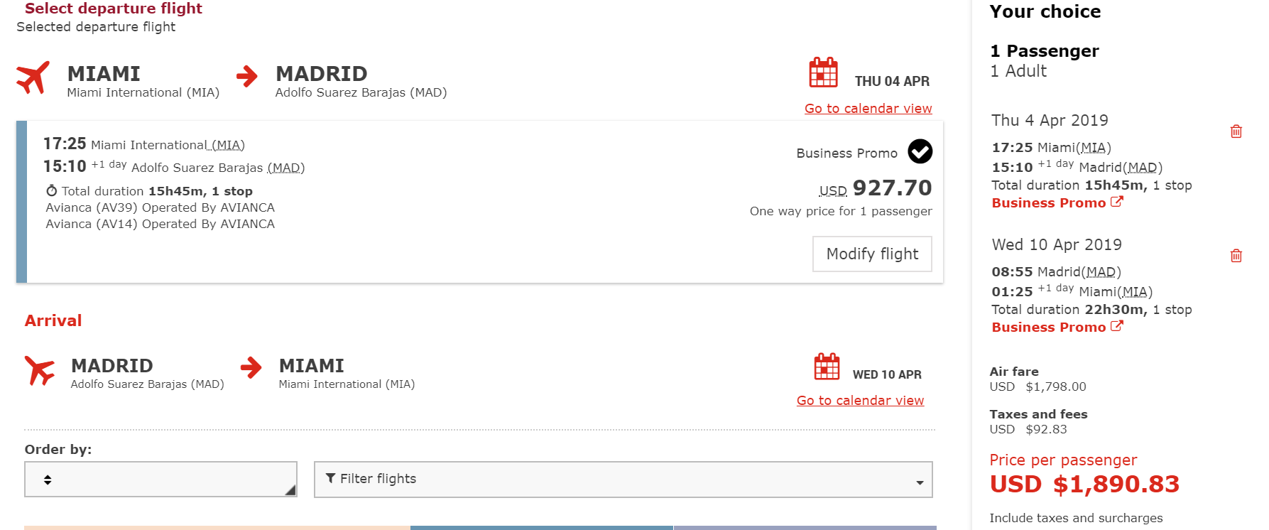 Miami (MIA) to Madrid (MAD) for $1,891 round-trip in business class in April on Avianca: