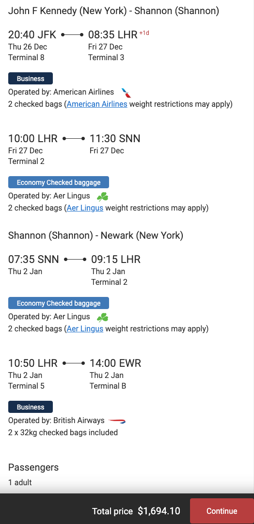New York (JFK) to Shannon (SNN) for $1,694 round-trip in business on British Airways/Aer Lingus: