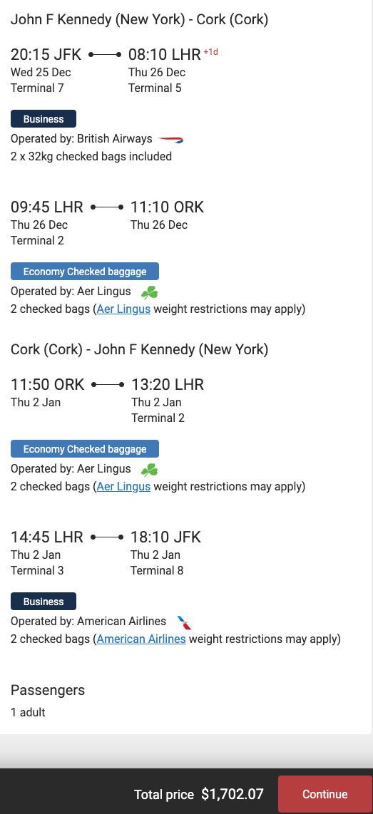 New York (JFK) to Cork (ORK) for $1,702 round-trip in business on British Airways: