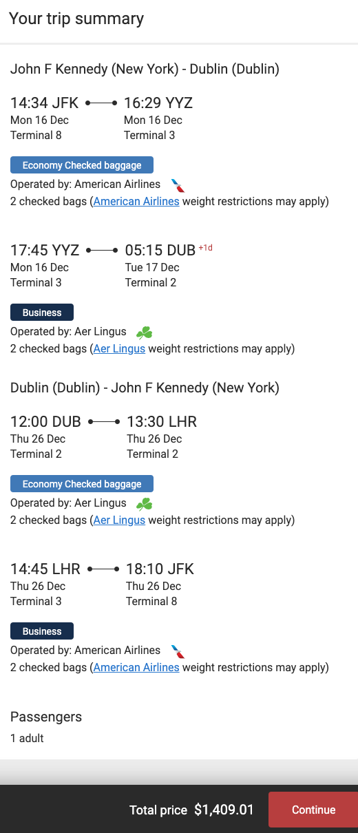 Despite only paying around ~$1,400, the flights from JFK to Dublin (with a connection through London-Heathrow) will earn the following when credited to American Airlines AAdvantage: