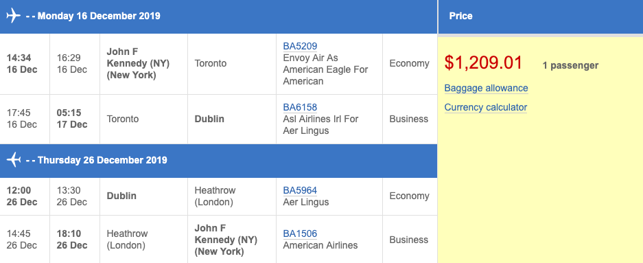 Business class fares from New York City area airports (JFK/EWR) to Ireland are available for as low as $1,409 round-trip. This is a steal considering business class tickets for this route are usually in the upper $2,000's. It's possible there are other routes outside of the ones listed, so if you see cheap British Airways business class fares, make sure to pay attention to the below section to save even more.