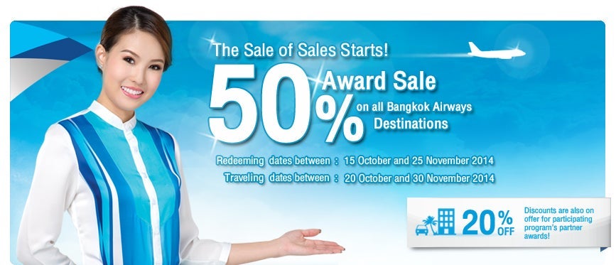 Bangkok Airways 50% Off Award Sale Bangkok Airways Flyerbonus is having an award sale where you can get 50% off award flights between October 20-November 30, 2014, that are booked between October 15 and November 25. The discount is available for one-way or return economy and business class flights. You can also get 20% off partner hotel awards.