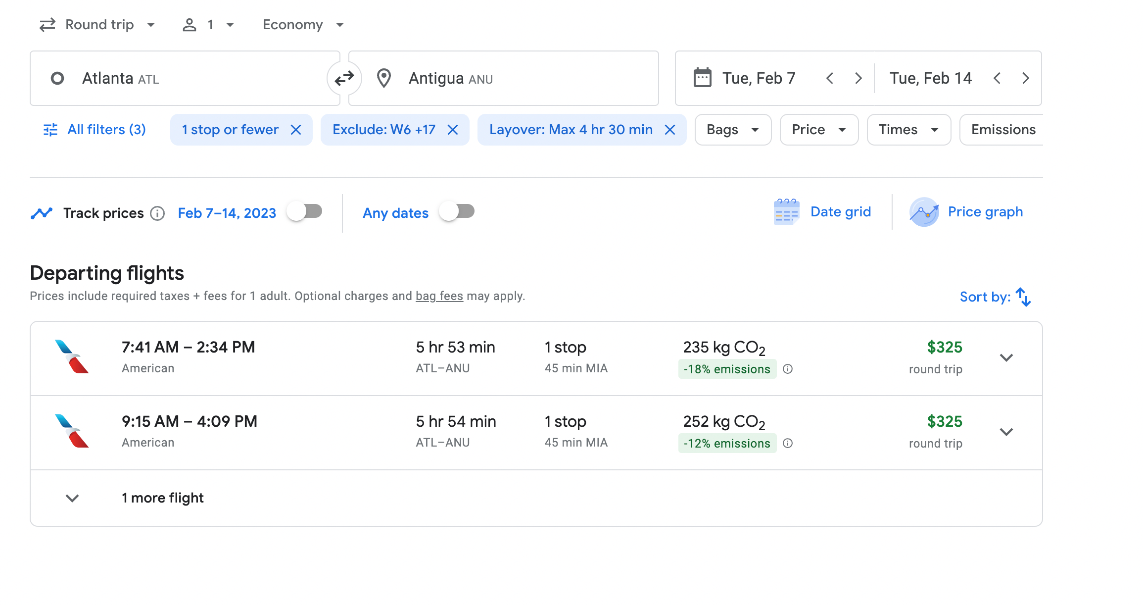 Looking through Google Flights, American gives two options for a flight from Atlanta to Antigua on Feb. 7. One flight departs Atlanta at 7:41 a.m. and the other departs at 9:15 a.m., so there isn't a significant difference in timing — it just depends on how early you'd like to show up at the airport. Both flights also include a 45-minute layover in Miami.