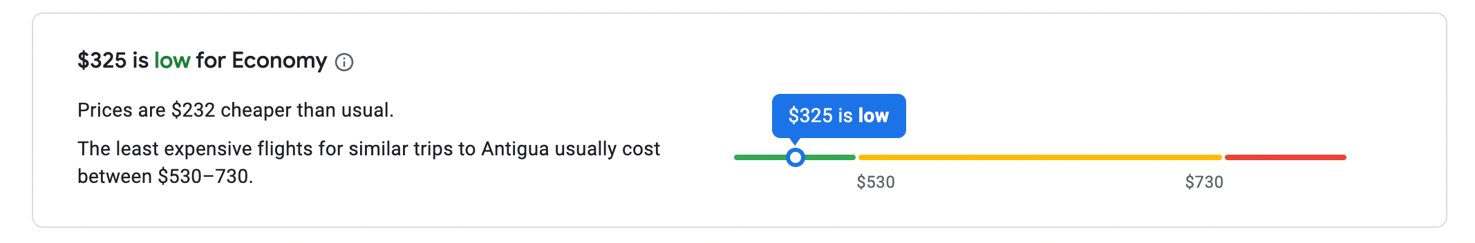 At around $325, the fare is considered to be low for economy — prices for economy flights to Antigua typically cost anywhere between $530 and $730, according to Google Flights.