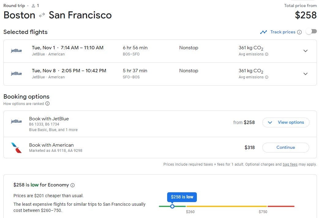 As shown in the Google Flights search results above, you can currently find round-trip tickets between Boston and San Francisco for just $258. This fare represents more than $200 per ticket savings versus typical fares.