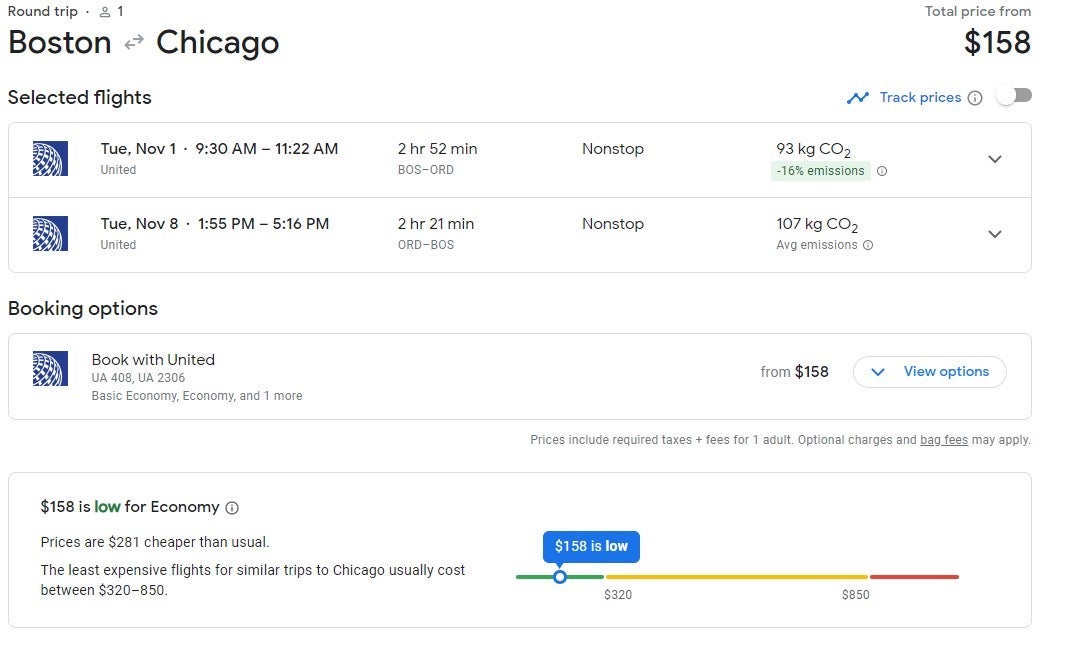 The sample flight listed here is between Boston and Chicago in the first week of November. Many of the discounted fares are for Tuesday-to-Tuesday itineraries like this one, but other date choices are also currently possible.