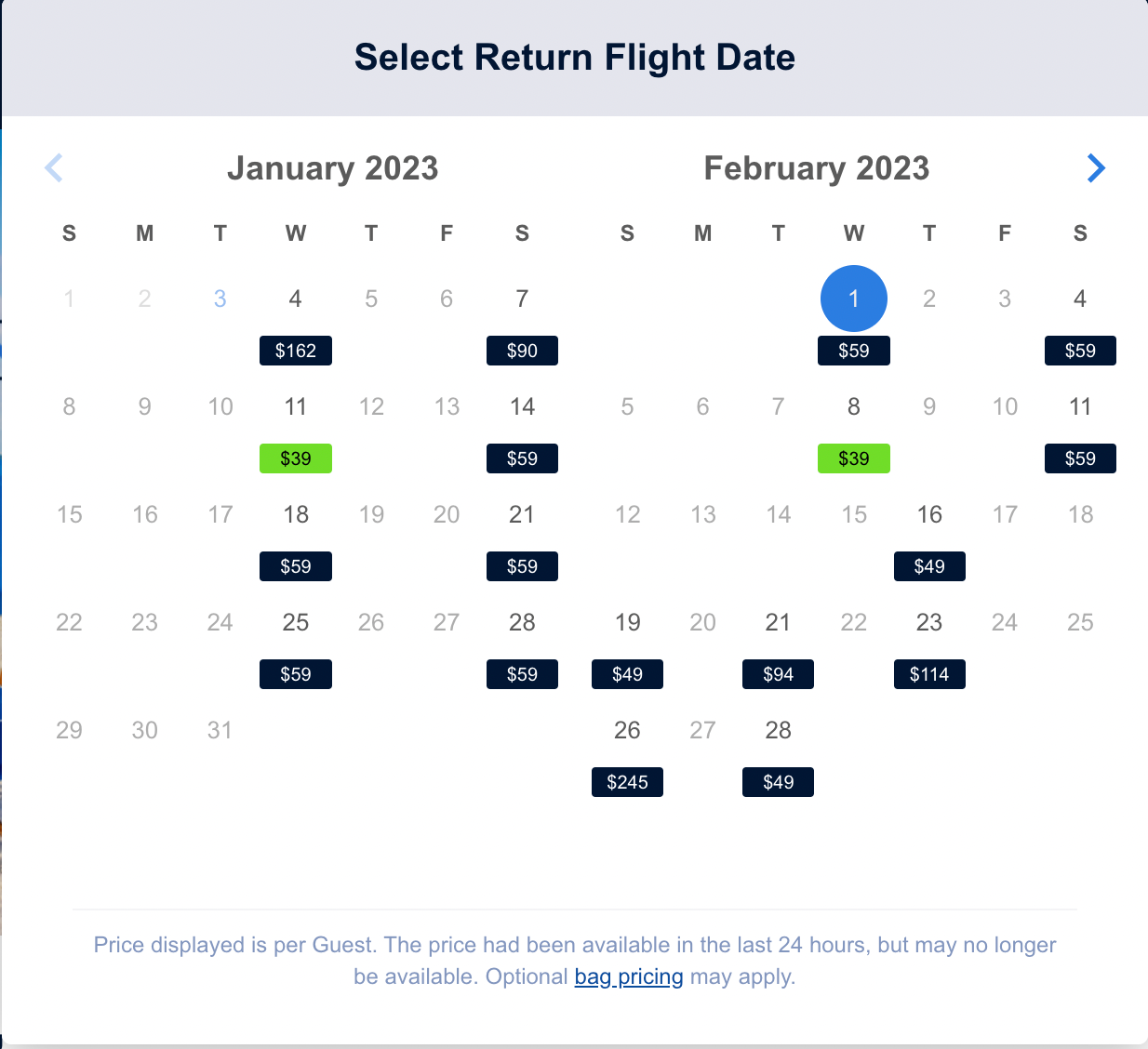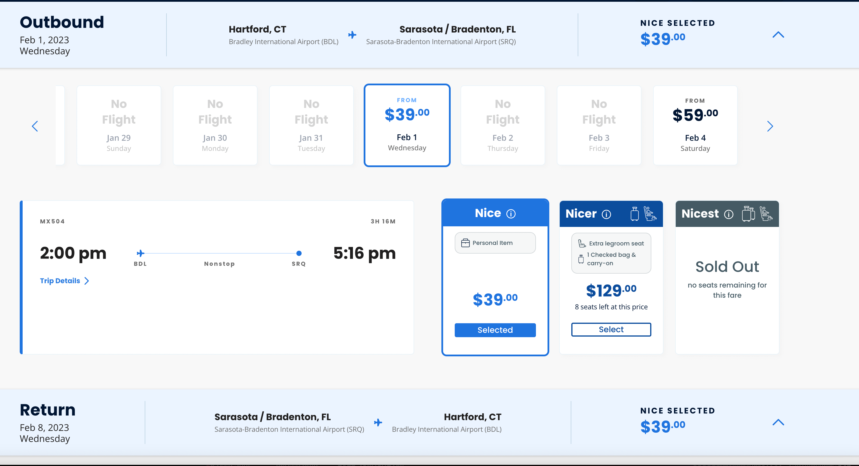 For example, a flight from Hartford to Sarasota, Florida, does not have much availability at the $39 one-way sticker price — only the dates Jan. 11, Feb. 1 and Feb. 8 have $39 one-way flights.