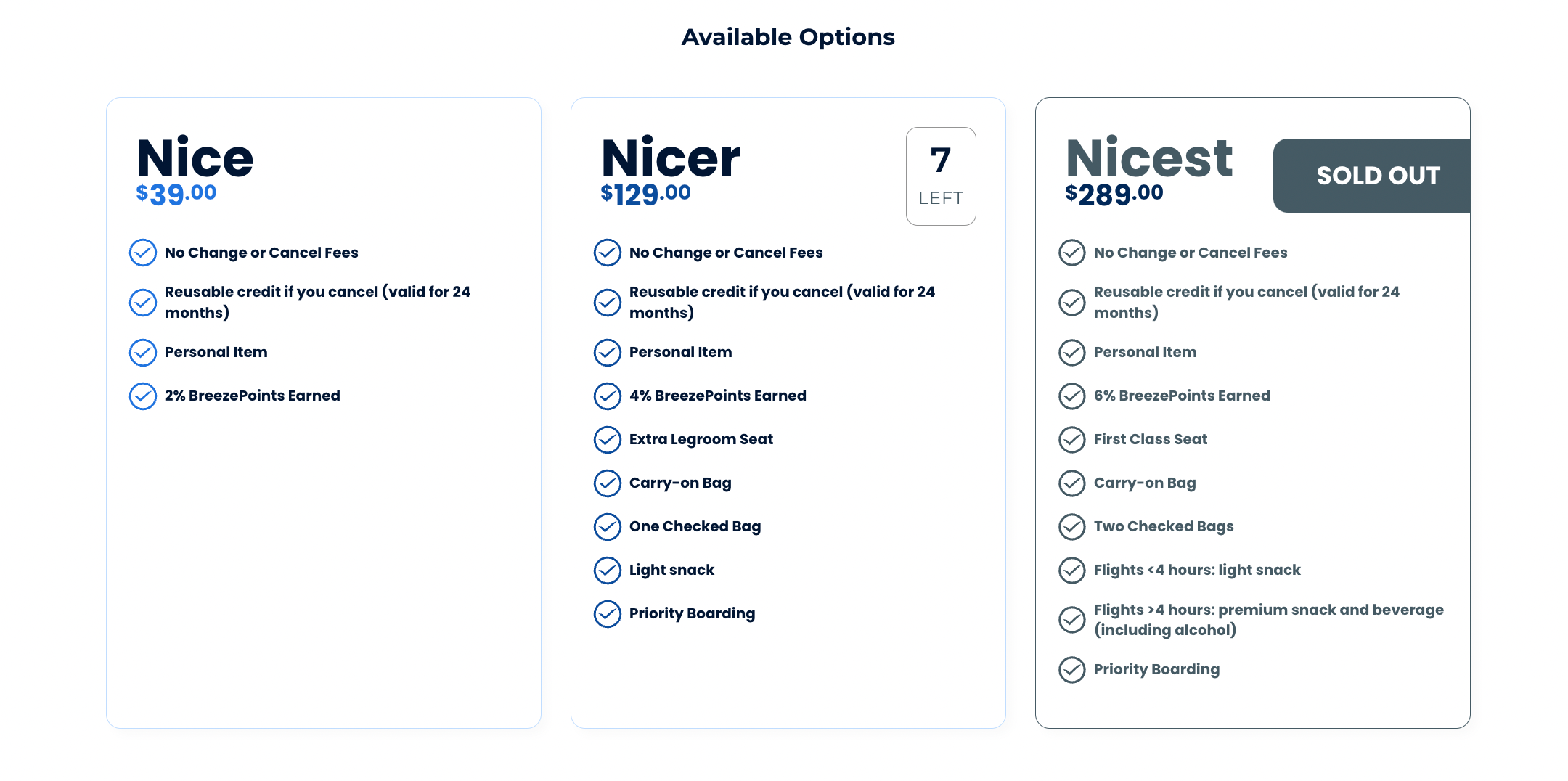 These fares are for Breeze's Nice class, which includes additional fees for seat selection and only allows passengers to bring one personal item. Standard seating on this flight ranges from $10 to $15 whereas seats with extra legroom cost $75.