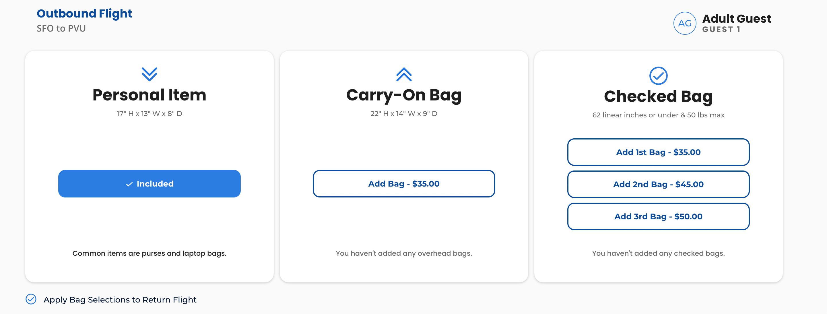 Checked baggage and carry-ons also have fees tacked onto them. A carry-on and the first checked bag both cost $35 each, one-way.