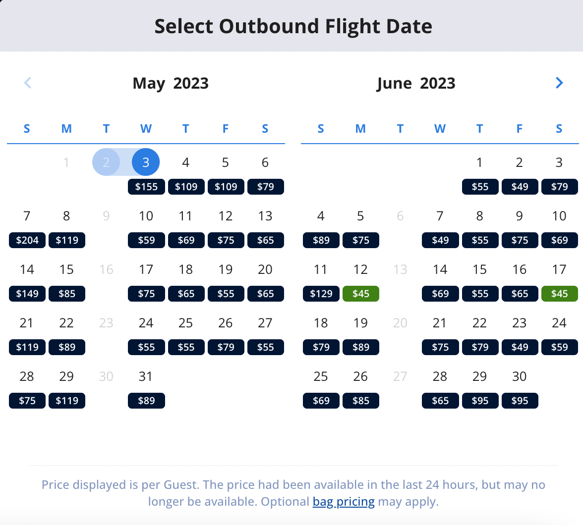 For example, for a flight from San Francisco to Provo, Utah, Breeze's fare calendar shows only June 12 and June 17 as the dates with the lowest fares at $45 each.