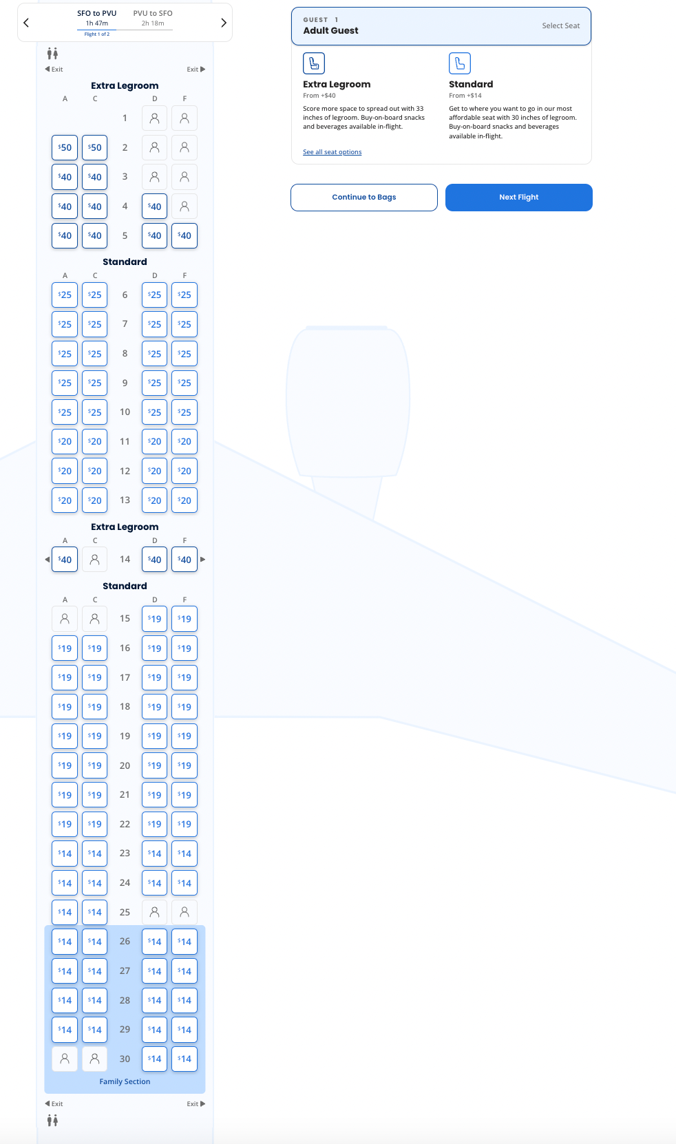 Seat selection starts at $14 for a standard seat. However, if you need more legroom, those seats start at $40 for these flights.