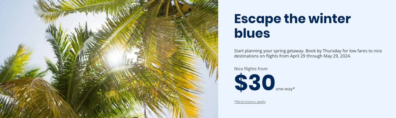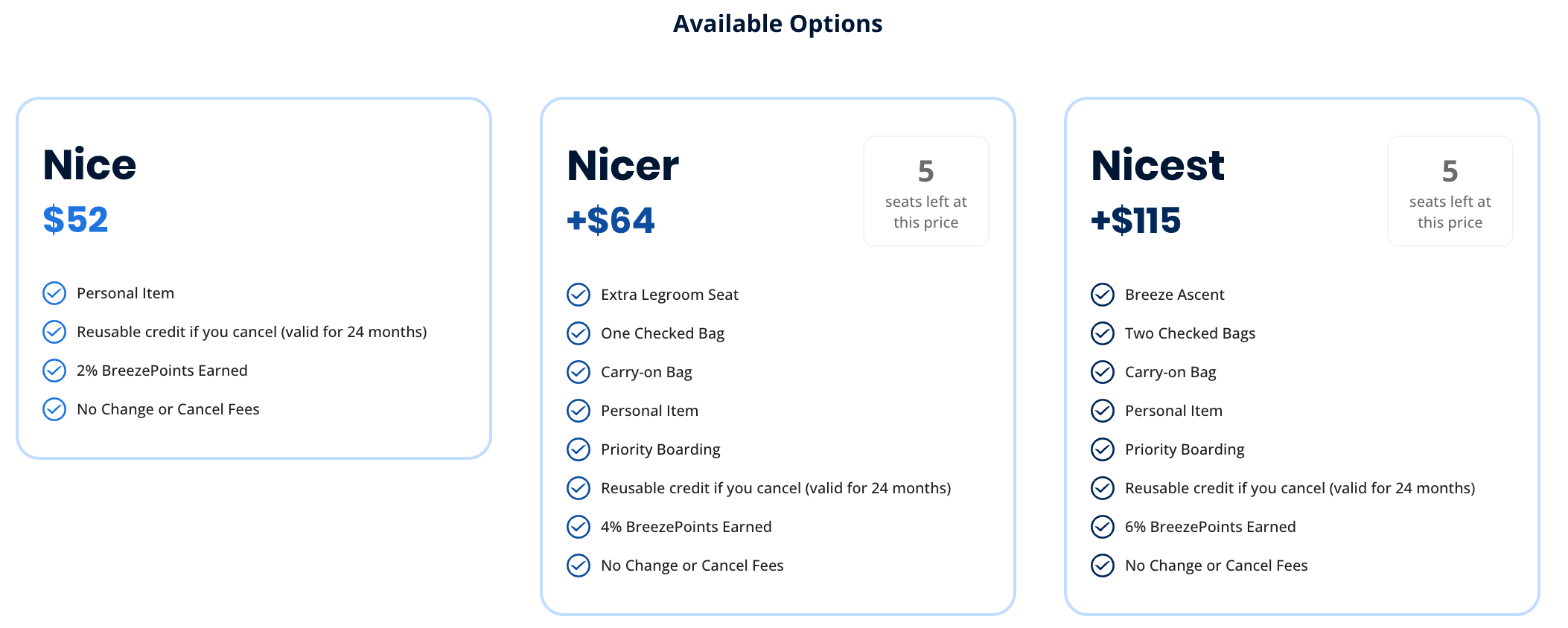 Discounted fares are for the carrier's Nice fare, which includes a personal item that can fit underneath the seat in front of you. So, factor in an additional $30 for a full-size carry-on item and $35 for checked luggage. Seat selection starts at $10 each way. However, Breeze does not charge fees to change or cancel your flight up to 15 minutes prior to departure. If you cancel your flight, you'll receive a flight credit valid for rebooking within 24 months.