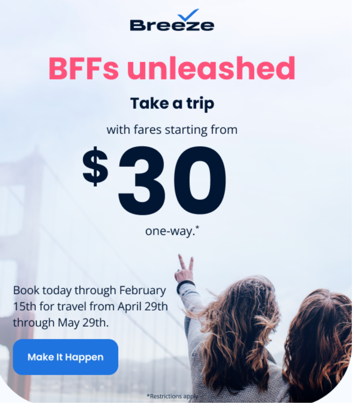To celebrate Valentine's Day, Galentine's Day or maybe just Feb. 14, low-cost carrier Breeze Airways is offering one-way flights starting at $30 across its network for travel in April and May.