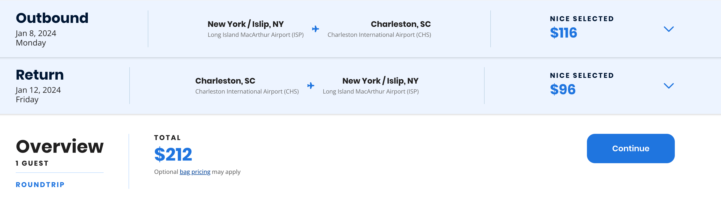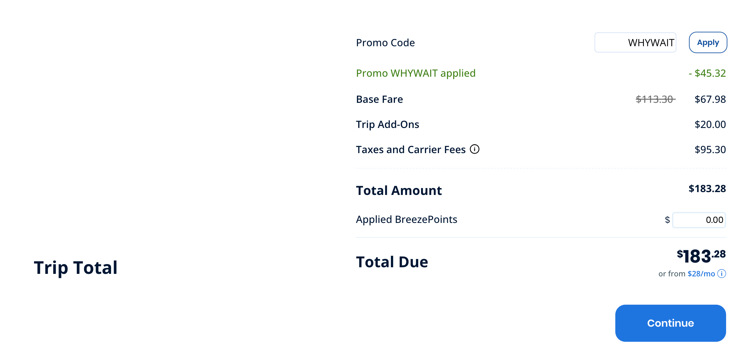Note that the 40% discount applies to the base fare and does not include taxes and fees. Additionally, you'll need to factor in extra charges for baggage and seat selection. All Breeze fare types include a personal item, while fees for full-size carry-on items and checked luggage start at $30 and $35, respectively. Standard seats begin at $10 each way.