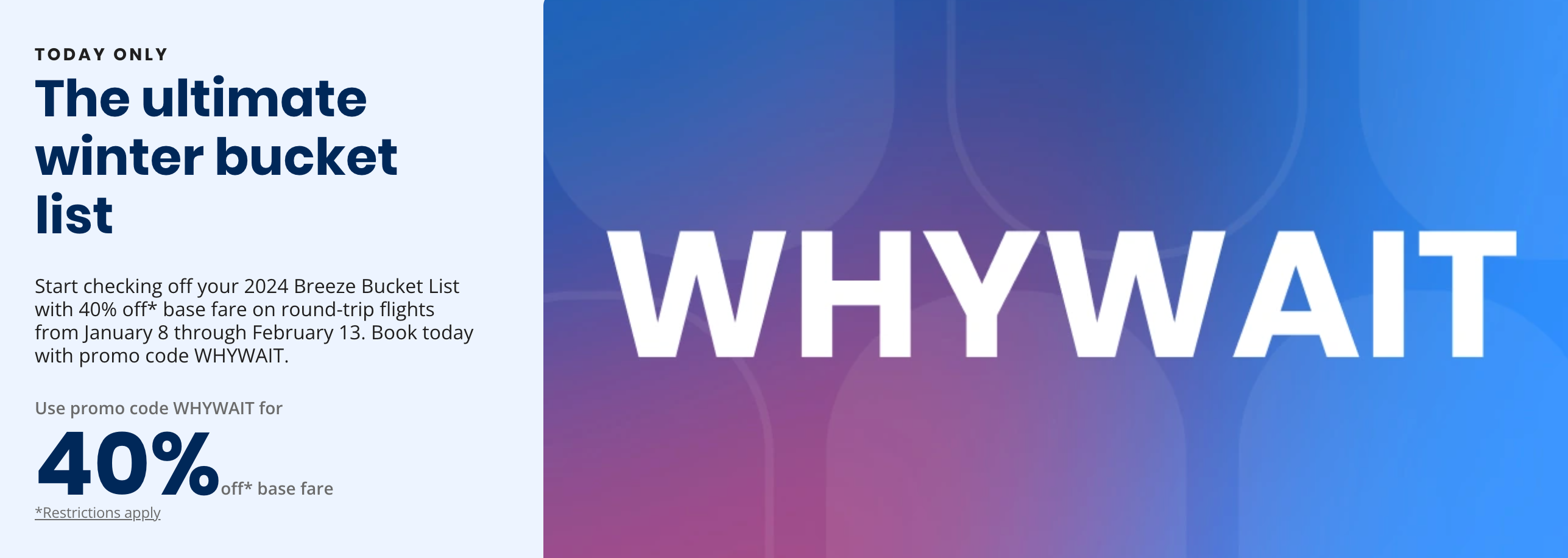 For one day only, low-cost carrier Breeze Airways is offering 40% off round-trip flights across its entire network for travel through Feb. 13, 2024.