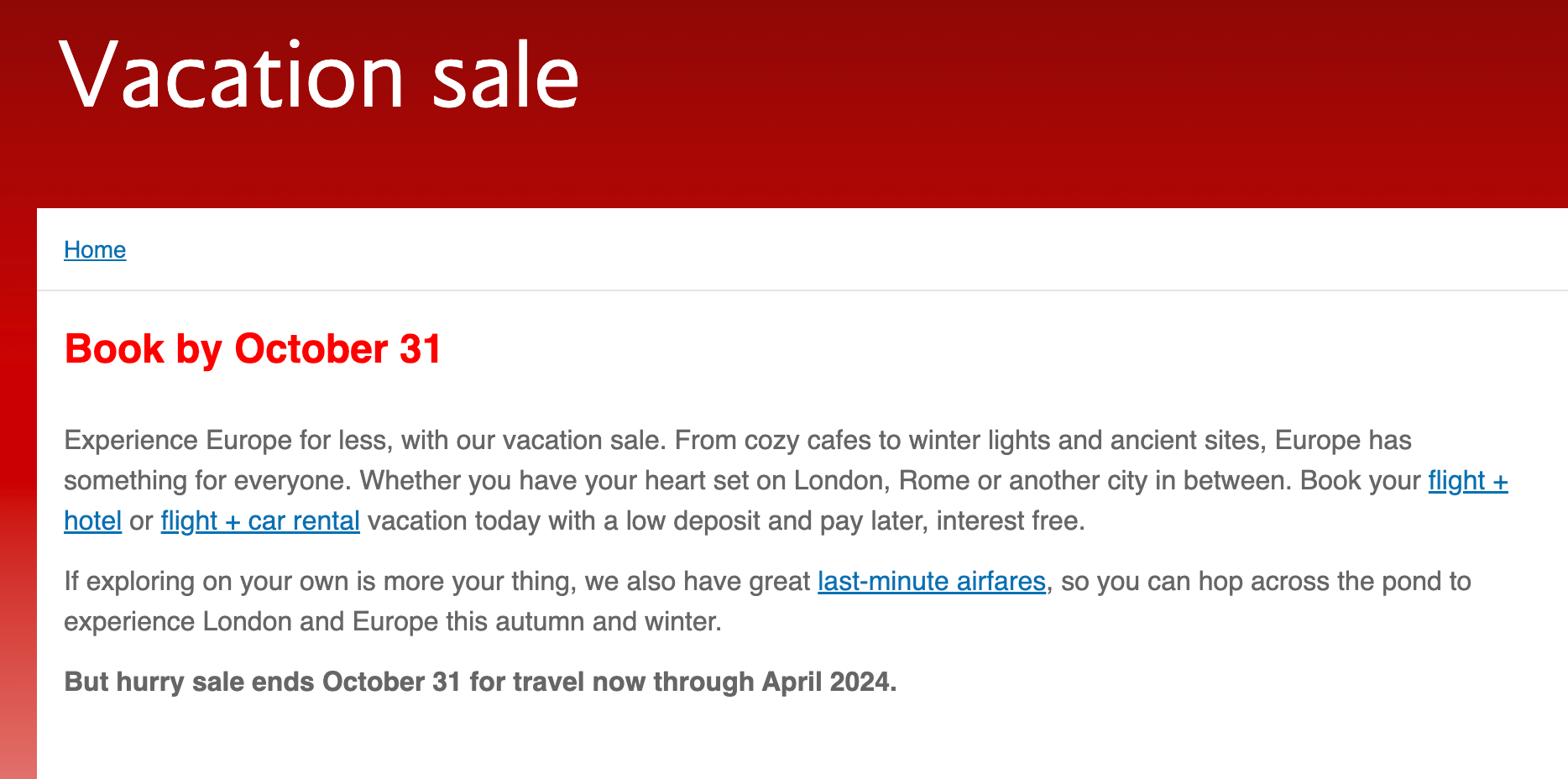 In addition to flights, this sale encompasses discounted vacation packages, including round-trip flights and five nights in a hotel from New York, Boston, Washington, Chicago and Los Angeles to London, starting at $899. Packages with flights from the same cities and rental cars start at $769. Packages with business-class flights and hotels are also available, starting at $3,199.