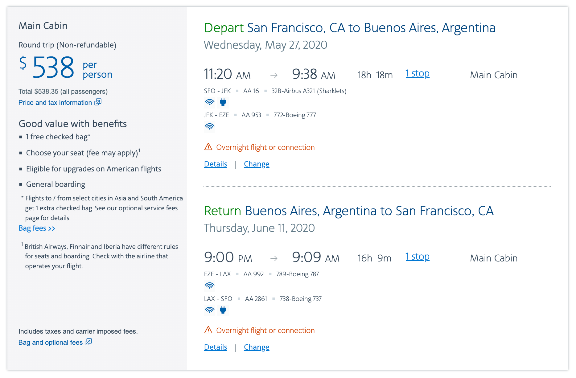 San Francisco (SFO) to Buenos Aires (EZE) for $538 round trip on American: