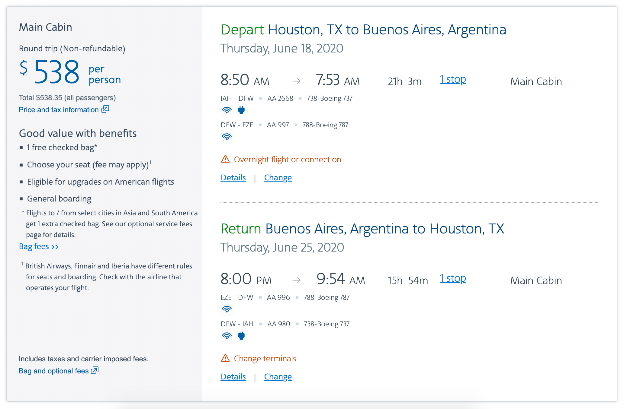 Houston (IAH) to Buenos Aires (EZE) for $538 round trip on American: