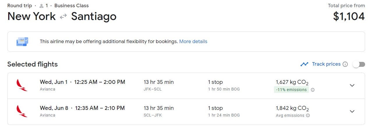 Flights from New York (JFK) to Santiago (SCL) are available for $1,104 round-trip. According to Google Flights, the offer is over $900 cheaper than usual for the same dates in June.