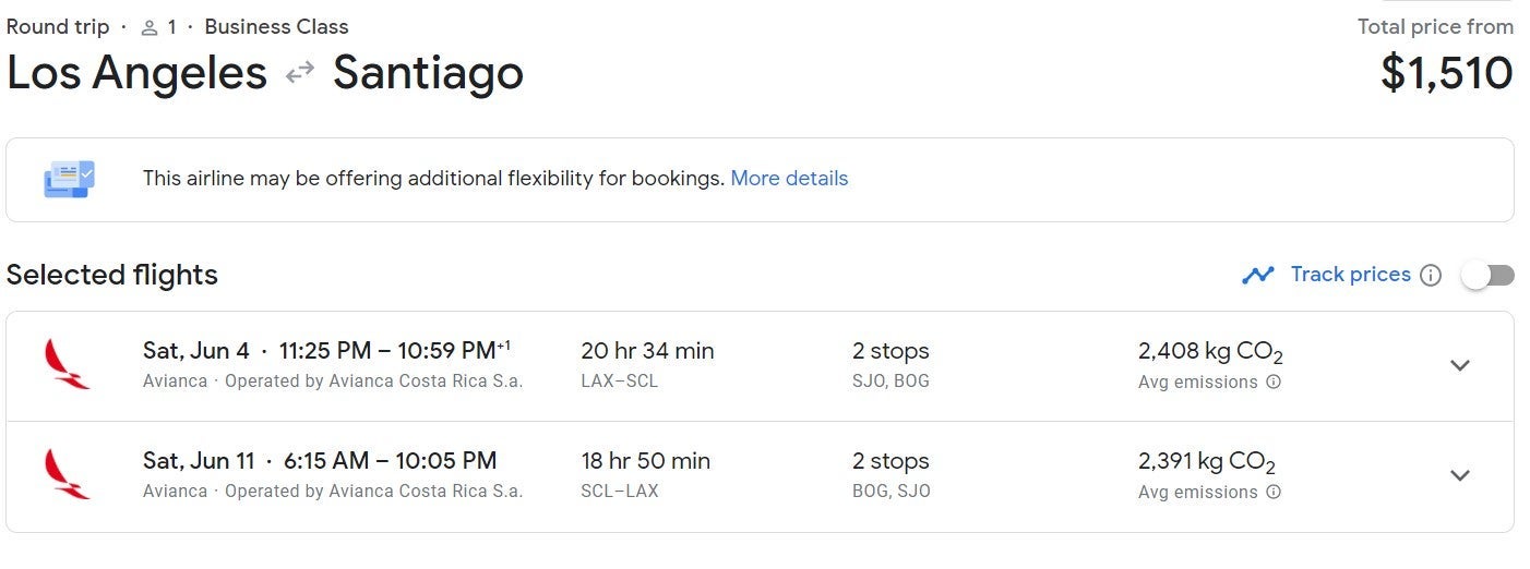On the West Coast, flights from Los Angeles (LAX) to Santiago (SCL) are $1,510 round-trip and include two stops, one in Bogota (BOG) and another in San Jose (SJO), Costa Rica. According to Google Flights, the deal at this price is $565 cheaper than usual for the dates below in June.