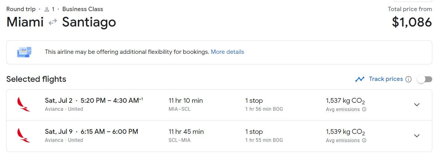 Travelers can book a widely available deal from Miami (MIA) to Santiago (SCL) for $1,086 round-trip and include a nearly two-hour stop in Bogota (BOG).