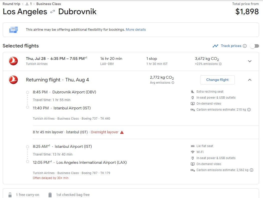 We did find a deal just under $1,900 that has limited availability. From the end of July to the beginning of August, you can snag a business class ticket for $1,898 round-trip from Los Angeles (LAX) to Dubrovnik (DBV). There is a lengthy overnight layover in Istanbul (IST) on the return flight.