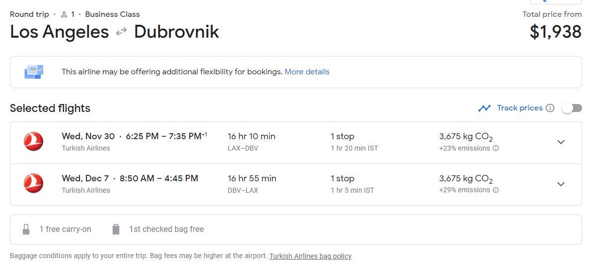 Offers at $1,938 round-trip to Dubrovnik (DBV) from Los Angeles (LAX) are available for most dates from April to December. The one below is from the end of November to the beginning of December, with short stops in Istanbul (IST) each way.