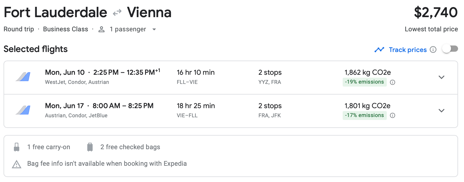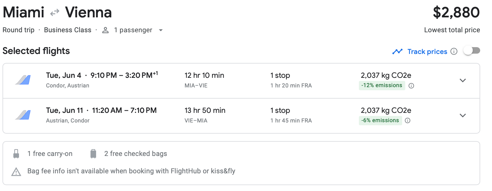 Let's start with Vienna. We found round-trip business-class fares from Miami to Vienna in June for less than $2,800 on Condor. That's a good price, but it involves two layovers each way.