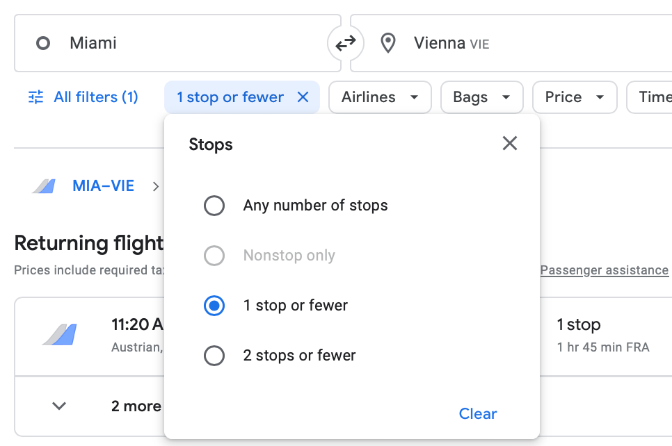 We wanted to check the availability and prices for flights with just one layover, so we selected the "1 stop or fewer" button in the drop-down menu on Google Flights to see what came up.