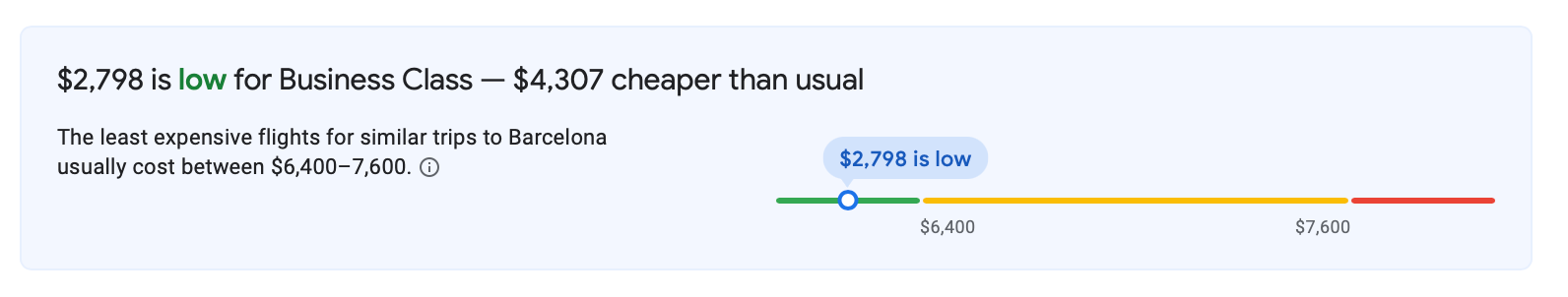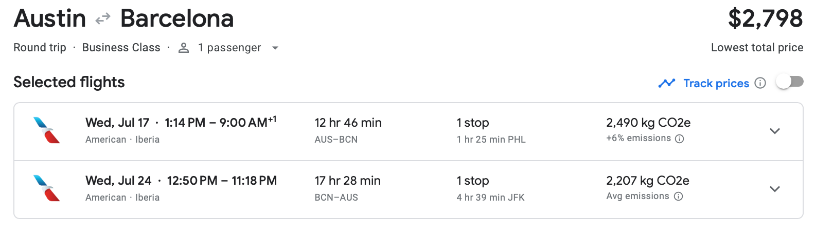 We found a fantastic deal from Austin to Barcelona as well. American Airlines has business-class fares from AUS to BCN in July for less than $2,800.