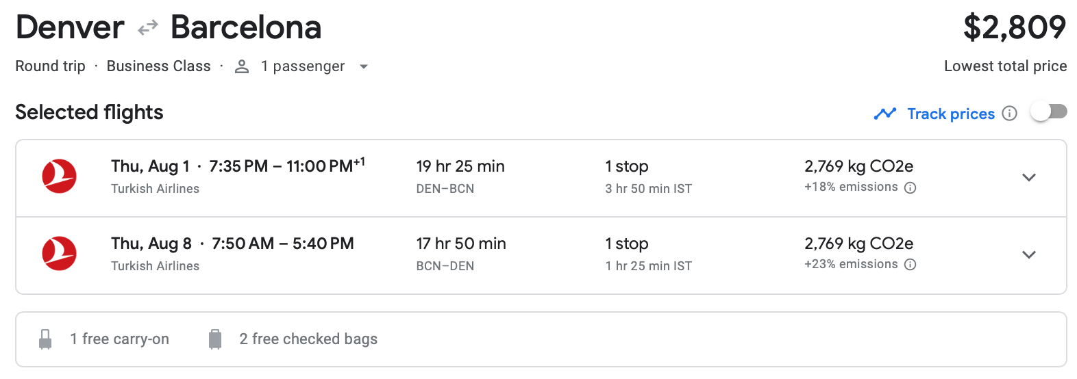 TPG told you that Turkish Airlines is launching its new nonstop service from DEN to Istanbul Airport (IST) on June 11. While searching for bargains in this sale, we found business-class seats on Turkish Airlines in August from Denver to Barcelona, with a layover in Istanbul, for only $2,809 round-trip. Not only is that a good price, but you also get to enjoy the 12-hour flight to Istanbul in one of the airline's Airbus A350 business-class suites.