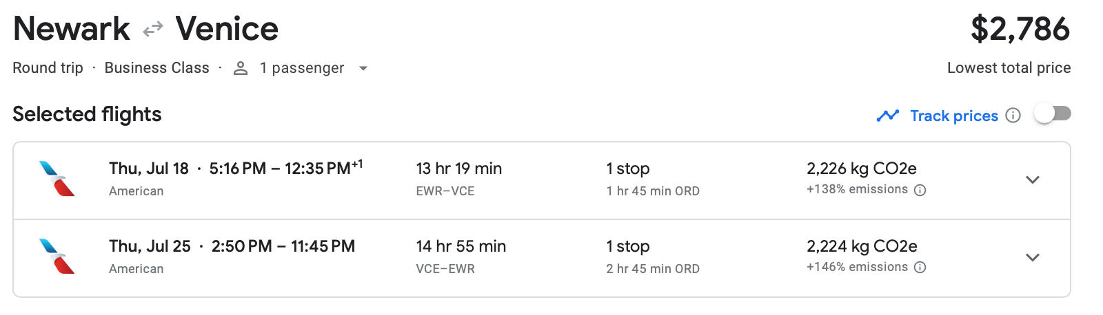 If you live in the tri-state area and have the City of Canals on your mind for summer vacation, you're in luck. There is good business-class availability in July and early August from Newark to Venice on American Airlines for just $2,786 round-trip.
