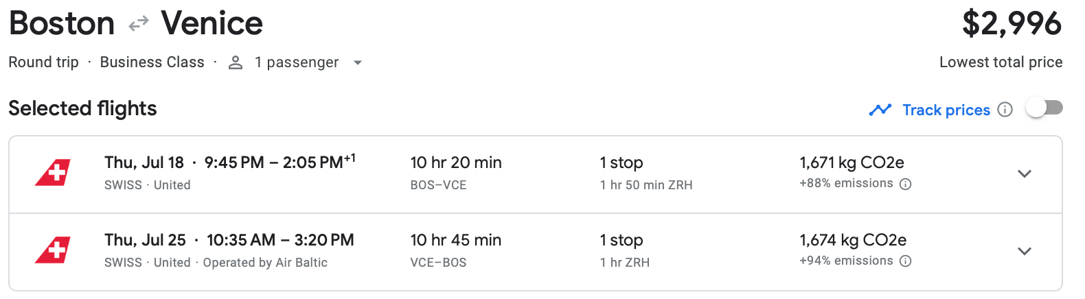 You can book business-class seats on Swiss from Boston to Venice in late July for less than $3,000 round-trip — a great price for this route.