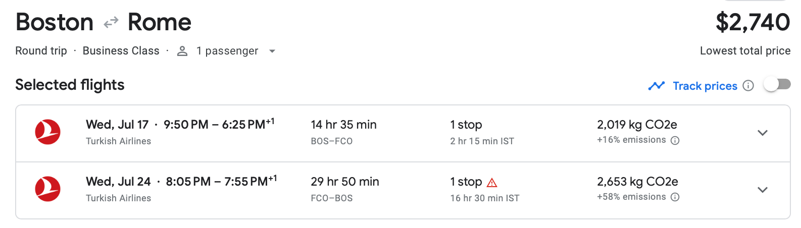 If you live in Boston and are looking to fly to Rome, Turkish Airlines has good discounted business-class options in July. This itinerary from BOS to FCO is available for just $2,740 round-trip. As an added bonus, the flight from Boston to Istanbul (for the layover) is in a lie-flat seat.