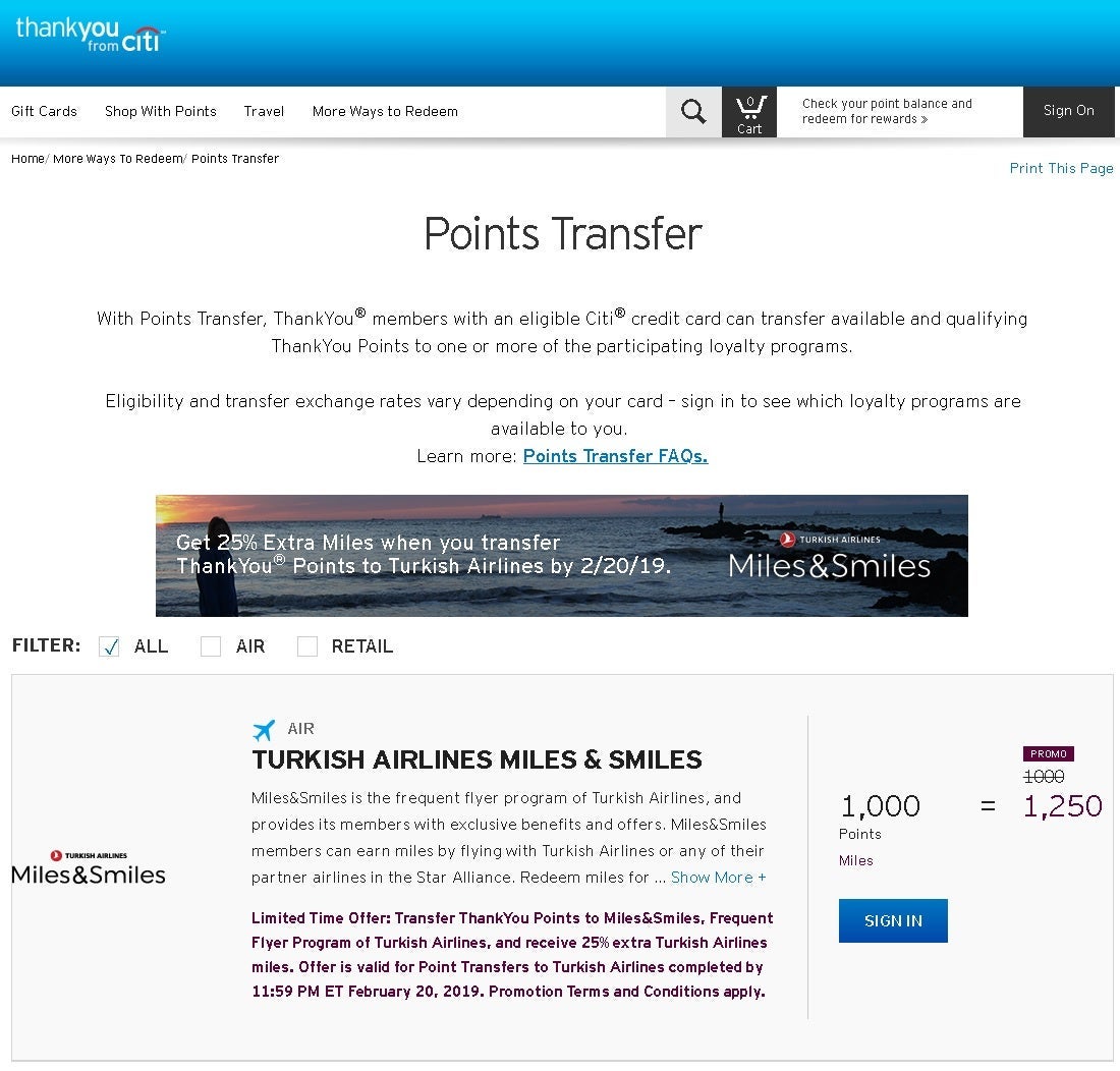 The Citi ThankYou Rewards program is currently offering a 25% bonus when you transfer your points to the Turkish Airlines Miles&Smiles frequent flyer program. For every 1,000 ThankYou points you transfer with this promotion, you'll receive 1,250 Turkish Airlines miles. This offer is valid until midnight Eastern Time on February 20.