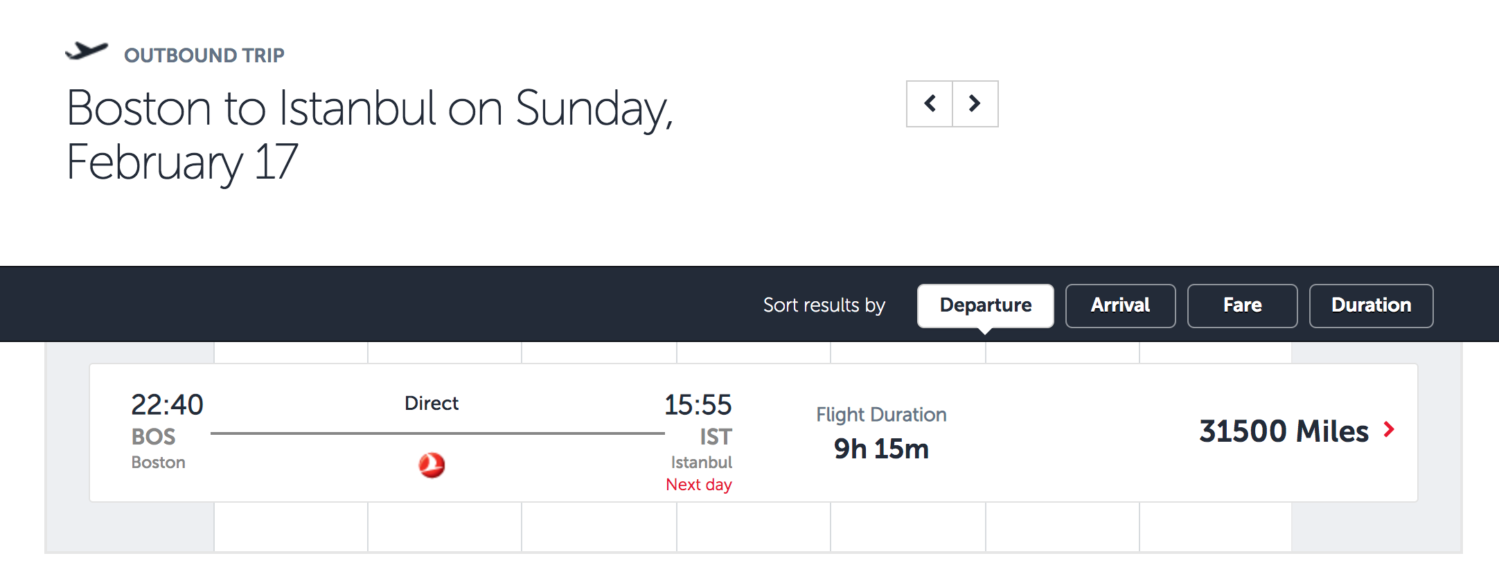 As a result, through February 20, 2019, you can transfer 51,000 Citi ThankYou points and have enough Turkish miles to book a round-trip, business class ticket to Istanbul from Boston, Chicago-O'Hare, New York-JFK or Washington-Dulles. I've searched through the end of February, and found plenty of dates with awards available from those cities.