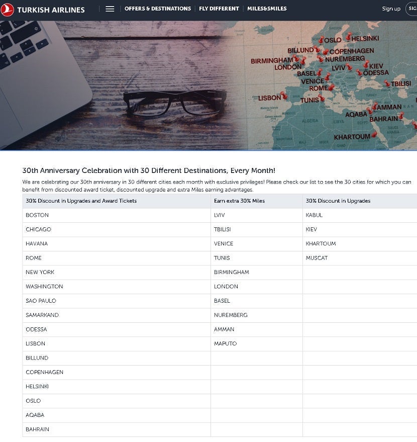 To celebrate the 30th anniversary of its Miles&Smiles frequent flyer program, Turkish Airlines is offering 30% off award flights to and from select destinations each month. For the month of February, US destinations include Boston (BOS), Chicago-O'Hare (ORD), New York-JFK and Washington-Dulles (IAD), and there are several foreign destinations featured. Normally, award tickets to Europe are priced at 45,000 miles each way in business class, and 30,000 miles each way in economy. It's also offering 30% bonus miles or a 30% discount on upgrades from select destinations. Better yet, this promotion is promised to continue "each month," presumably for the rest of 2019. So keep your eyes out for other deals in March and beyond (even though the Citi promotion ends on February 20th).