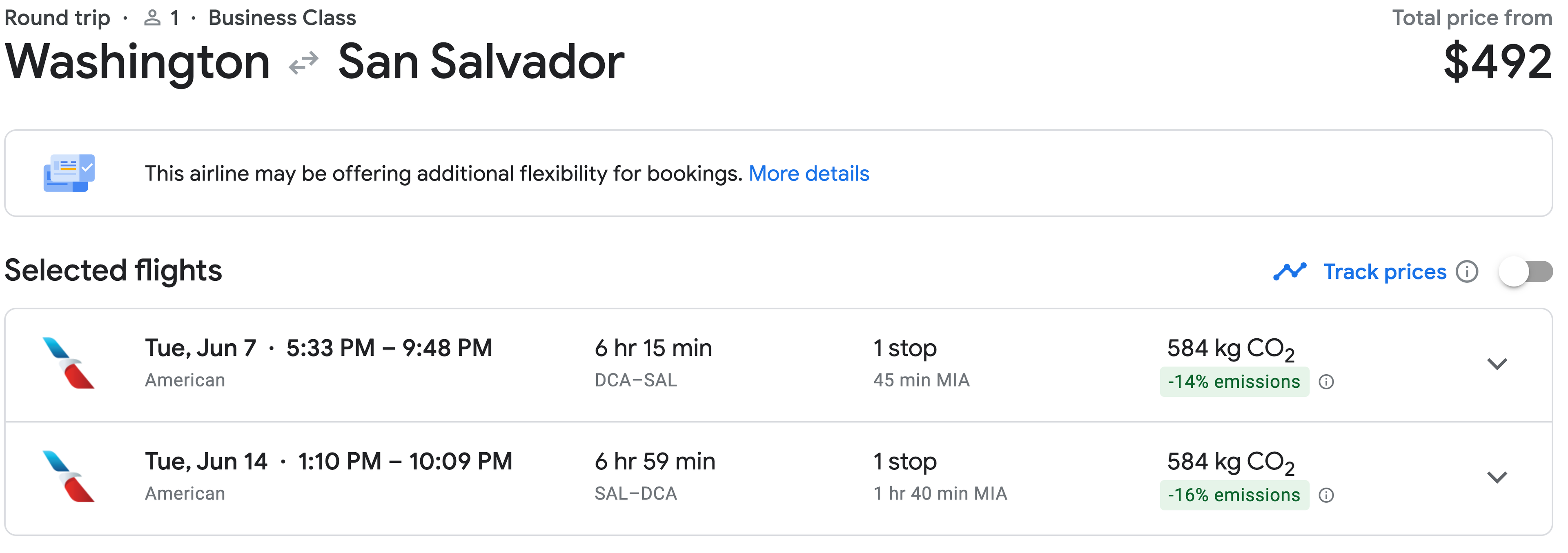 Travelers from the Washington area can fly from Reagan Airport (DCA) to San Salvador (SAL) for $492 round-trip. There are scattered dates available at this price between March and early June, with more availability between September and November.