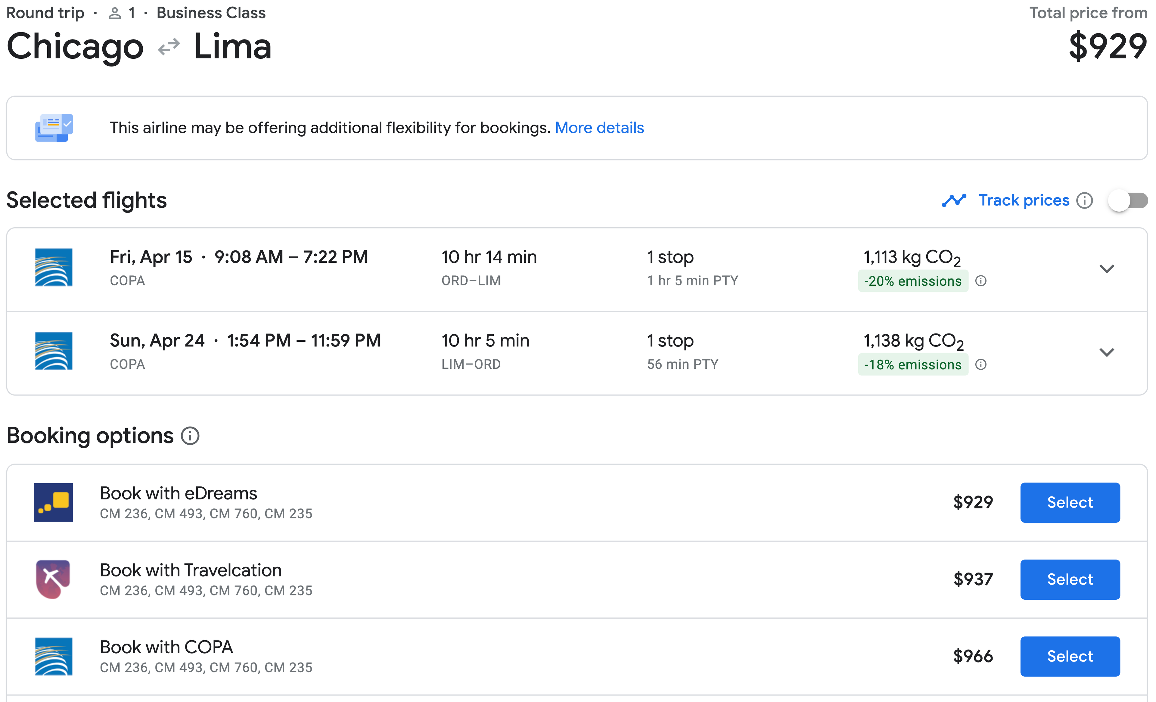 Copa Airlines is selling business class flights from Chicago (ORD) to Lima (LIM) for $929 round-trip. These seats are just standard recliners, but there is widespread availability through early December. Here’s an example for a trip over Easter in April.