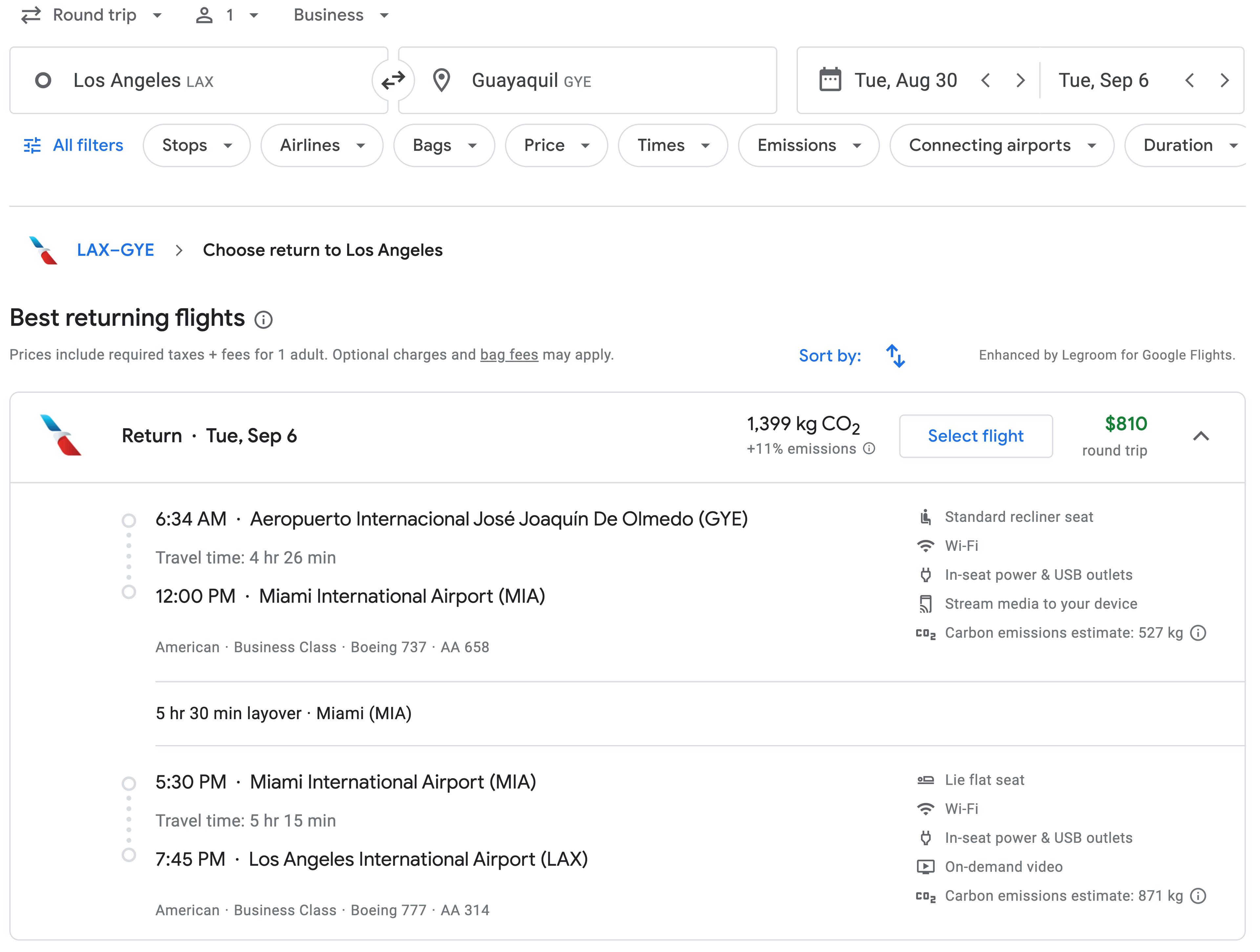 From Los Angeles (LAX), I found flights on American Airlines to Guayaquil (GYE) for $810 round-trip over Labor Day. These flights include lie-flat seats on American’s Boeing 777 between Los Angeles (LAX) and Miami (MIA). This fare can be found on select dates through May, and there is more availability between August and early December. From Guayaquil, you can easily hop over to the Galapagos Islands.
