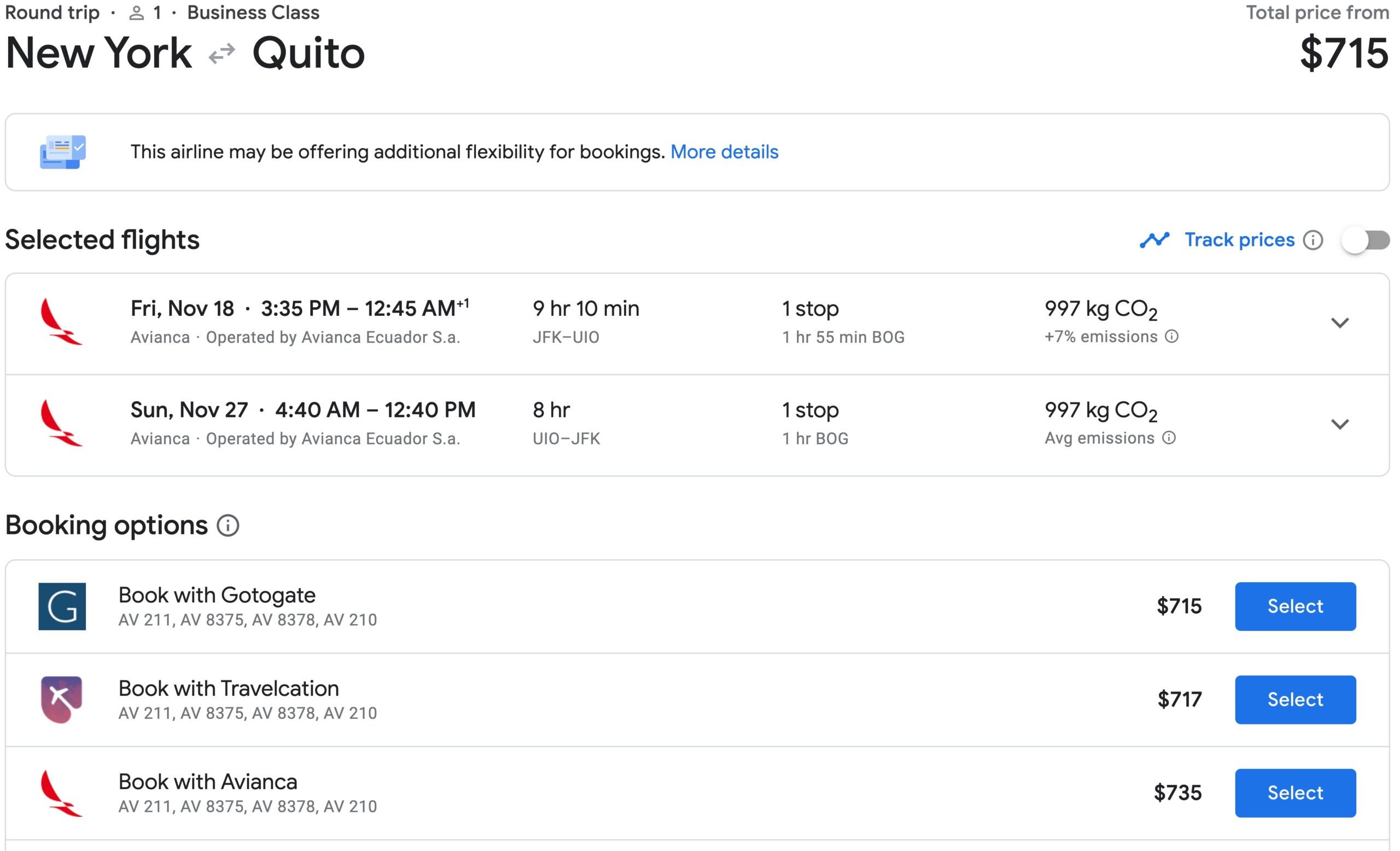 As an example, here’s a flight over Thanksgiving from New York (JFK) to Quito (UIO) priced at $715 round-trip in business class. The flight between New York and Bogota (BOG) is in a lie-flat seat. This price is available on nearly all travel dates through June and from September through early December.